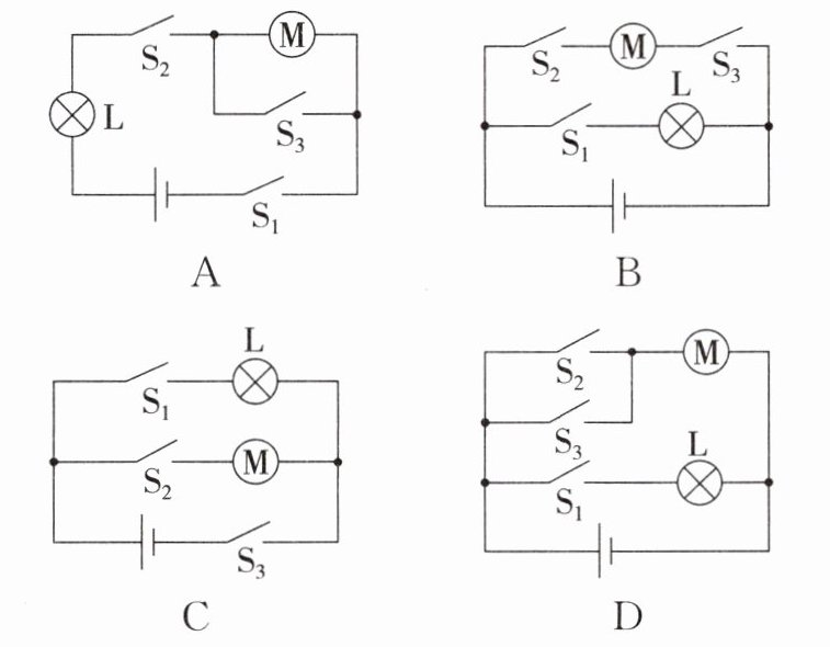 解析:选 B.由题意可知,照明灯与喷雾电动机可以独立工作,因此灯泡与电动机并联;开关S₁只控制照明灯,开关S₂、S₃控制电动机,且两开关相互影响,因此S₂、S₃串联在电动机支路上,S₁在灯泡支路上,故A、C、D不符合题意,B符合题意.故选 B.