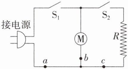 6. 如图所示是某取暖器的简化工作电路图.图中元件$ \textcircled{M} $是装有扇叶的电动机,元件 $ R $ 通电时会产生热量.若只闭合开关 $ S_{1} $,取暖器______