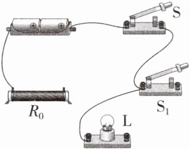7. 小明设计了一款道路井盖移动报警电路.该电路由电源、警示灯 $ L $、保护电阻 $ R_{0} $、开关 $ S $ 和 $ S_{1} $ 组成.闭合开关 $ S $,当井盖未被移动时,相当于开关 $ S_{1} $ 闭合,警示灯 $ L $ 不亮;当井盖被移动时,相当于开关 $ S_{1} $ 断开,警示灯 $ L $ 发光提醒路人.请根据以上要求,将图中的电路补充完整.