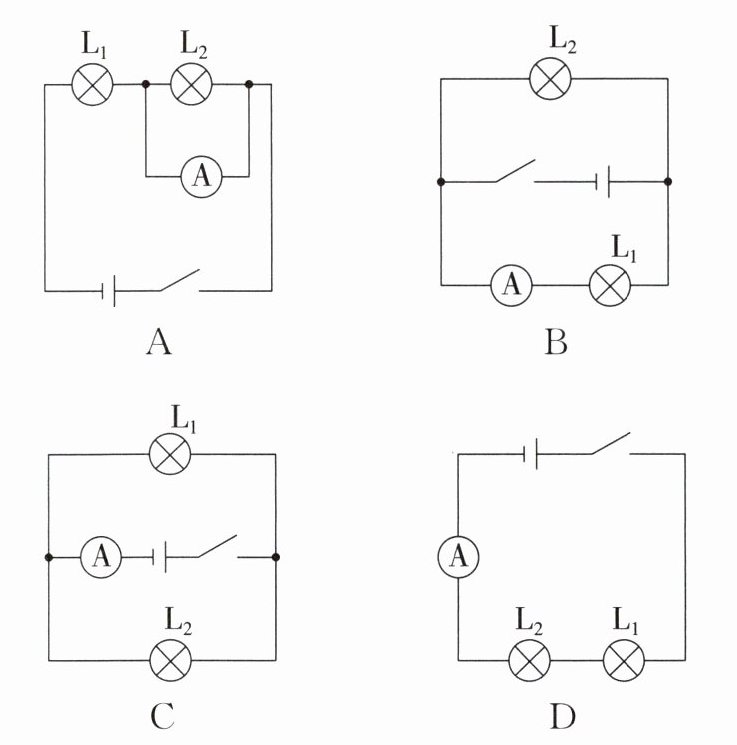 4. 下列电路中,闭合开关后,电流表能正确测量出通过灯泡$L_2$电流的是 (