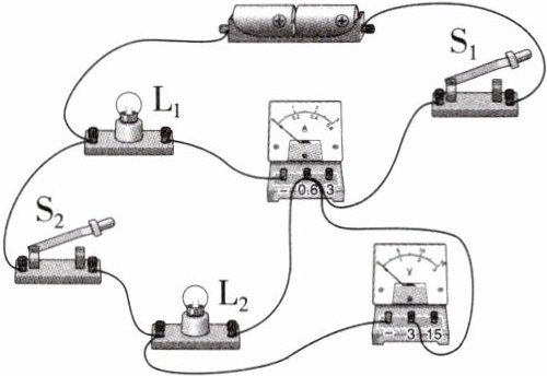 5. 在如图所示电路的空缺处,分别填入一个电流表和一个电压表的元件符号,使得开关闭合时,两灯都发光.