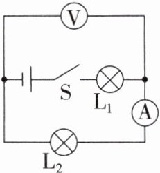 解析:选C.电路中两灯泡串联,电压表测灯泡$L_{2}$两端的电压,当灯泡$L_{2}$灯丝断了后,电路中没有电流流过,电流表示数为零,两灯泡均不能发光,但灯泡$L_{2}$两端外的电路还是完好的,此时电压表测的是电源电压,即电压表示数变大.