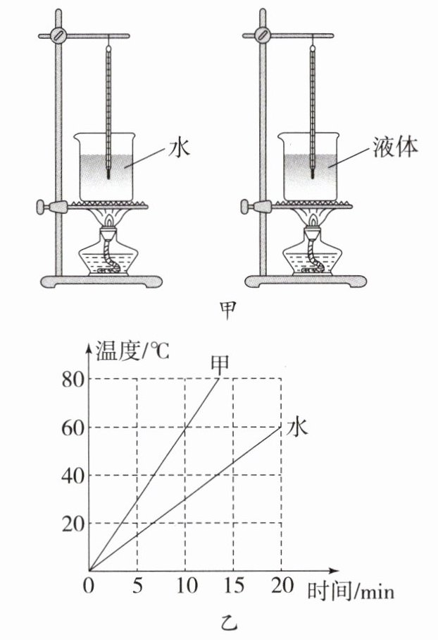 2. 小明用相同的酒精灯对质量都为 $200g$ 的液体甲和水加热,如图甲所示,根据测得的数据分别画出两液体的温度随加热时间变化的图像,如图乙所示. 已知在相同的时间内两液体吸收的热量相等,不计热量损失,$c_{水}= 4.2×10^{3}J/(kg·℃)$,下列推断正确的是(