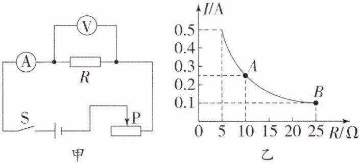 3. 在“探究电流与电阻的关系”的实验中,电路如图甲所示,多次改变电阻$R$的阻值,并记录对应的电流表示数,得到如图乙所示的电流随电阻$R$变化的图像。由图像可以得到电压表示数始终保持