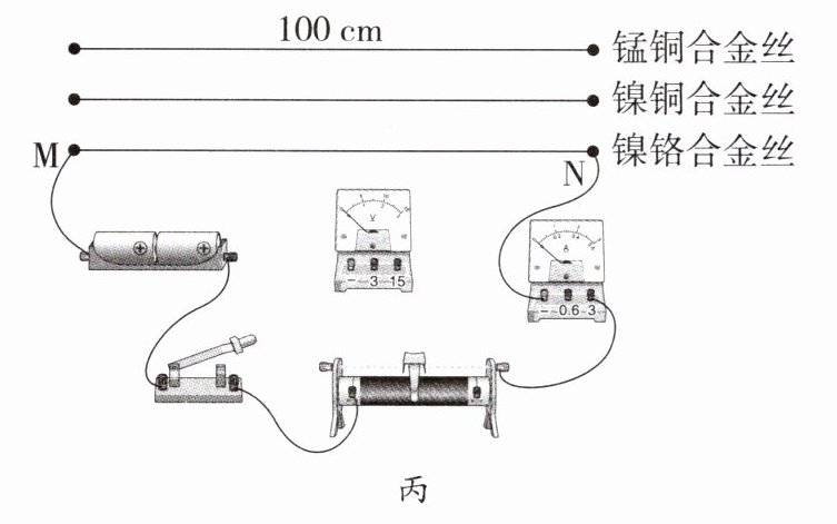 (4)小明要进一步测量长度为100cm的镍铬合金丝MN的阻值,器材如图丙所示。其中导线只有7根,且长度均为30cm。请根据实际操作需要,用笔画线代替剩余2根导线,在图丙中将实物电路示意图补充完整(实物图中导线及电阻丝长度未按照比例绘制)。要求:导线两端只能接在各电路元件的接线柱上。