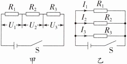 6. $R_{1}$、$R_{2}$、$R_{3}$是三个阻值不同的定值电阻.将它们串联起来接入电路,如图甲所示,闭合开关后,测得各电阻两端的电压关系为$U_{1}>U_{2}>U_{3}$;若将它们并联起来接入电路,如图乙所示,则闭合开关后,通过每个电阻的电流大小关系为(