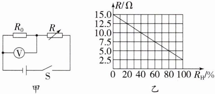 4. 如图甲所示是小梦设计的电加湿器简化电路工作原理图. 电源电压恒为$6V$,定值电阻$R_{0}的阻值为5Ω$,$R$为湿敏电阻,其阻值$R随环境湿度R_{H}$的变化如图乙所示,电压表的测量范围为$0\sim 3V$. 闭合开关$S$,在保证电路安全的情况下,下列判断正确的是(