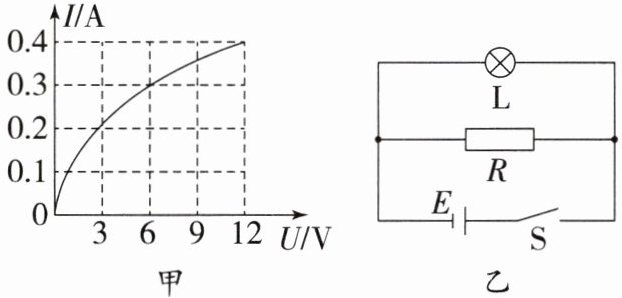 9. 如图甲所示是通过灯泡$L$的电流跟其两端电压关系的图像. 现将$L与阻值为10Ω的电阻R$连入图乙所示电路. 闭合开关$S$,$L的实际功率为1.8W$. 则电源电压是