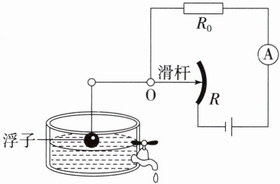 4. 如图所示是一种测定油箱内油量的装置。其中$R$是滑动变阻器的电阻片,滑动变阻器的滑片跟滑杆可以绕固定轴$O$转动,另一端固定着一个浮子。当油箱中的油量减少时(