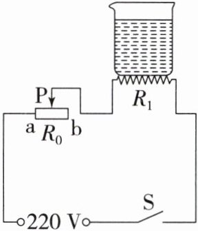 5. 在某科技节上,小明同学自己动手制作了一个牛奶加热器,设计的电路简图如图所示,已知滑动变阻器$R_{0}的最大阻值为100\Omega$,用于加热的电阻丝$R_{1}的阻值为55\Omega$。求闭合开关$S$后: