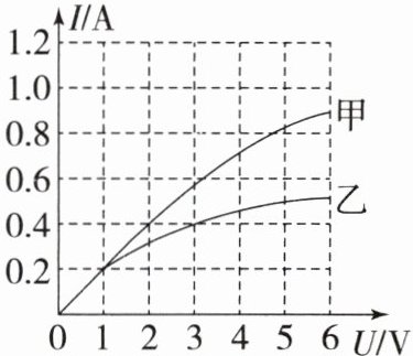 3. 甲、乙两个灯泡,其$I - U$关系图像如图所示。现将甲、乙两灯串联在电路中,当甲灯两端的电压为$2\mathrm{V}$时,乙灯消耗的功率是(
