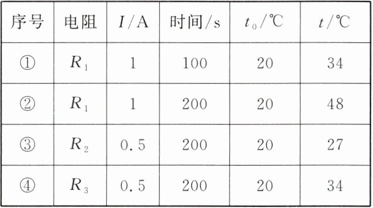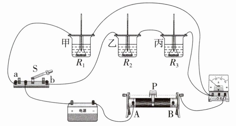 3. 用如图所示的装置探究影响电流热效应的因素。甲、乙、丙三个相同的容器内均装有质量相等的煤油,电阻丝$R_1、$$R_2、$$R_3$浸没在煤油中,其中$R_1= R_2= 5 Ω、$$R_3= 10 Ω。$闭合开关前,记录下煤油的初温度t₀,开关S接a、调节滑动变阻器滑片P,使电流表的示数为1 A,记录下第100 s和第200 s时甲容器中煤油的末温度t;开关S接b,调节滑片P,使电流表的示数为0.5 A,记录下第200 s时乙、丙容器中煤油的末温度t,断开开关,结果如下表,比较序号①②可得:当通过导体的电流和导体的____