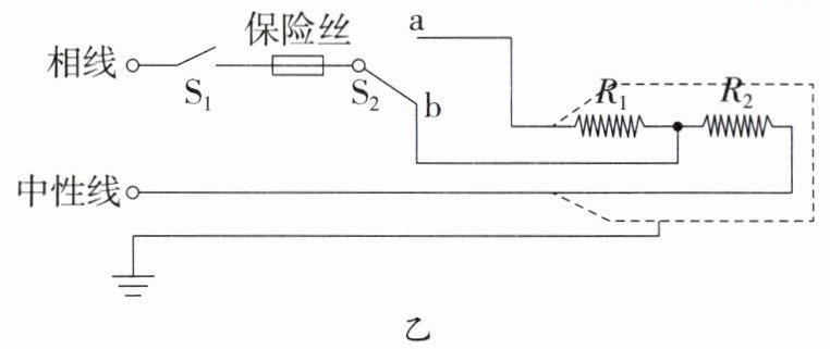 (2)由图乙可知,当开关$S_{1}$闭合,开关$S_{2}$接b时,电路中只有$R_{2}$,电路电阻最小,由$P=\frac{U^{2}}{R}$可知,饮水机处于加热状态,则$R_{2}$的阻值