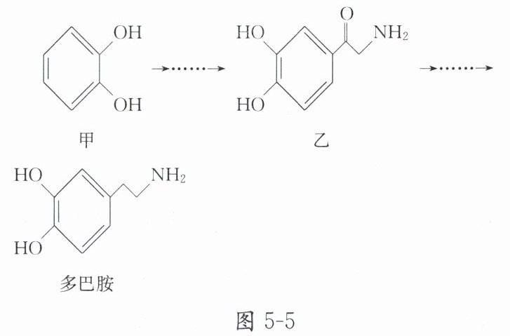 D [解析]根据多巴胺的结构简式可知其分子式为${C_8H_{11}NO_2}$,A项错误;苯环中每两个碳原子之间存在一个σ键,${C - O}$、${C - H}$和${O - H}$均为σ键,因此1mol甲分子中含有14molσ键,B项错误;苯环为平面结构,与苯环直接相连的原子一定与苯环共面,单键可以旋转,亚甲基上的碳原子也可能在苯环所在的平面内,因此多巴胺分子中所有碳原子可能处在同一平面上,C项错误;多巴胺的含苯环且与其含有相同官能团的同分异构体中分子结构对称性越强,不同化学环境的氢原子种数越少,故不同化学环境的氢原子种数最少的结构为