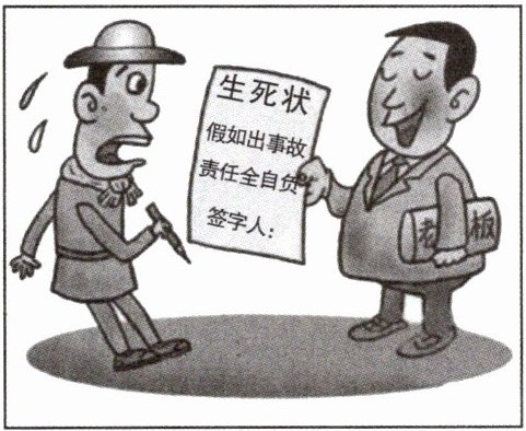 B 解析:该漫画中的“生死状”违反了订立合同的平等协商原则,含有违反法律、行政法规的强制性规定,属于无效合同,①④正确。签订这样的生死合同,劳动者往往是被欺诈或被胁迫的,并不是劳动者的真实意思表示,②错误。能签订劳动合同的,通常是具有民事行为能力的人,至少是限制民事行为能力人,③错误。