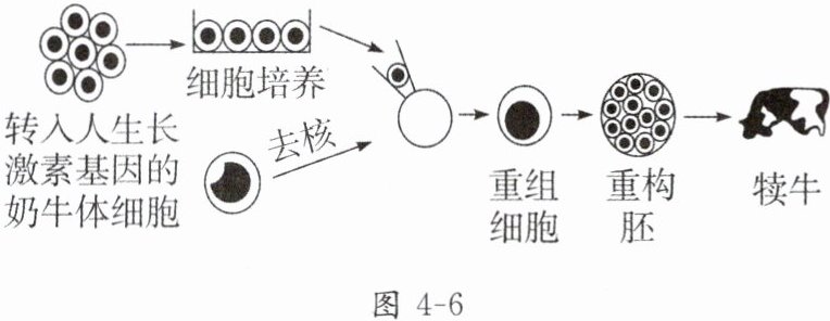 10. 科学家通过转基因技术获得了含有人生长激素基因的奶牛,如果要加快转基因奶牛的繁殖速度,可以对此转基因奶牛进行克隆,其过程如图4-6所示。请回答下列问题。