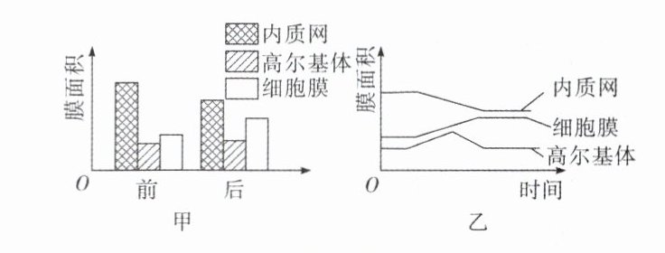 图甲和图乙分别以直方图和曲线图形式表示在分泌蛋白加工、运输过程中,内质网膜面积减小,高尔基体膜面积基本不变,细胞膜面积相对增大。