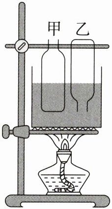 9. 如图所示,在玻璃瓶甲中盛适量的水,使之能浮在水槽中,将另一只同样的空玻璃瓶乙瓶口朝下按入槽内水中,并固定其位置,在1标准大气压下,对水槽内的水加热到沸腾时(