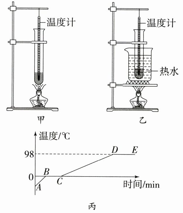(2)由图丙可知,BC段表示冰的熔化过程,冰在熔化过程中温度保持不变,可知冰是晶体.DE段表示水的沸腾过程,水温升高到98°C时温度保持不变,可知水的沸点是98°C.