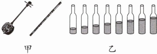 。生活中,我们也可以在 7 个相同的玻璃瓶中灌入不同高度的水,制成一个水瓶琴,如图乙所示,依次吹每个瓶子的瓶口,越靠近左端音调越低