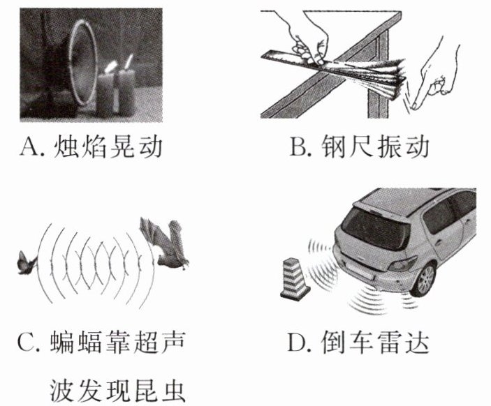 解析:选 A.A 项,图中烛焰晃动,说明声音可以传递能量,故 A 正确;B 项,钢尺振动可以发出声音,说明声音是由物体振动产生的,不能说明声音可以传递能量,故 B 错误;C 项,蝙蝠是靠发出的超声波被昆虫反射发现目标的,此现象说明声音可以传递信息,故 C 错误;D 项,倒车雷达是靠发出的超声波被障碍物反射发现车后物体的,此现象说明声音能够传递信息,故 D 错误.