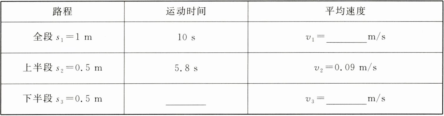 $ m/s $.(3) 比较分析表中实验数据:在通过相等路程时,所用时间不等,