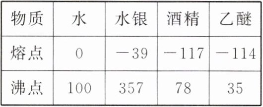 2. 我国寒冷地区的气温会达到 -52.3℃, 最高气温达到 49℃. 下表是 1 标准大气压下一些物质的熔点和沸点. 根据下表, 在我国各个地区都能测量气温的温度计是 (