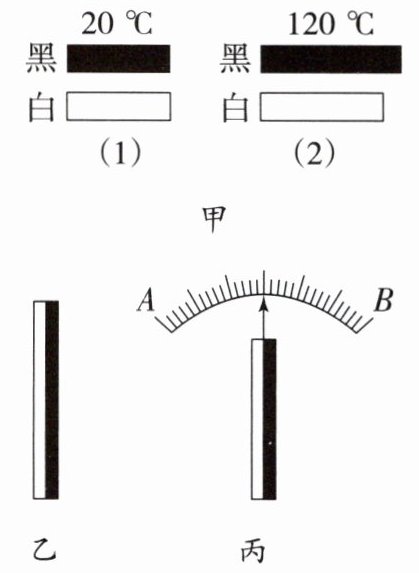 6. 除了液体, 利用金属片“在升高同样温度时, 膨胀的多少通常不同”的特点也可以制成温度计, 如图甲中的黑色和白色分别代表两种金属片, 分析图甲中的(1)、(2)可知, 在相同条件下,