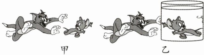8. 如图甲所示,一幅漫画竖立在桌面上,小明把一个装有水的圆柱形玻璃杯放在漫画前,惊奇地发现,透过水杯看到漫画中的老鼠变“胖”了,还掉头奔向猫,如图乙所示.下列仪器中与其成像原理相同的是 (