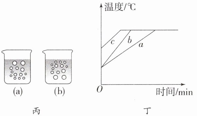 [选填“(a)”或“(b)”]是水沸腾时气泡上升过程大小变化的情况.(3) 小园根据自己记录的数据,画出的水温随时间变化的图像如图丁中 $ a $ 所示,小华实验时,仅烧水质量比小园的少,则她画出的图像是图丁中的