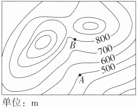 (4) 如图所示是某山区等高线地形图,若上表中的数据是小园在 $ A $ 点所在的位置进行实验获得的,现在将本实验移到 $ B $ 点所在位置进行,则小园测得的水的沸点可能是