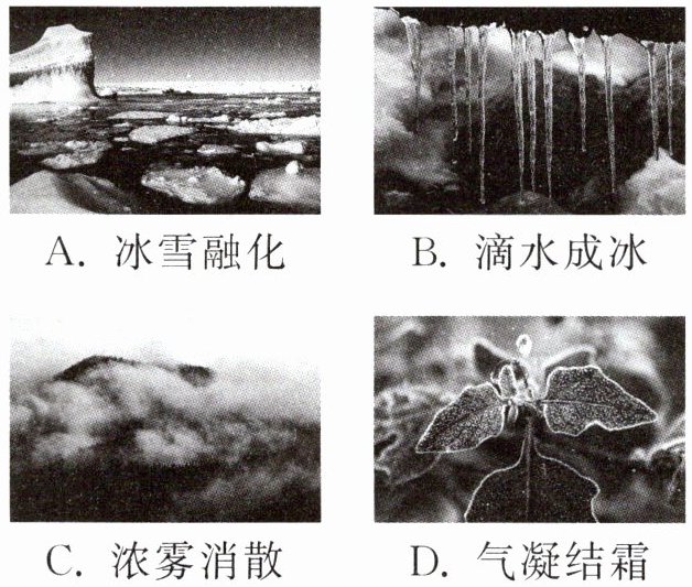 解析:选 D.冰雪融化是由固态变成液态,属于熔化现象,故 A 不符合题意;滴水成冰是由液态变成固态,属于凝固现象,故 B 不符合题意;浓雾消散是液态的小水珠变成了水蒸气,属于汽化现象,故 C 不符合题意;气凝结霜是空气中水蒸气在极低的温度中遇冷直接变成了小冰晶,属于凝华现象,故 D 符合题意.故选 D.