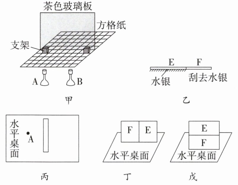 (5)实验创新:用美工刀将平面镜的一部分水银刮掉(相当于玻璃板),如图乙所示,有水银的部分为E,刮去水银的部分为F。将白纸平铺在水平桌面上,镜面与桌面垂直放置,图丙是实验过程中的俯视图,其中A表示棋子A的位置,人眼在棋子A一侧适当的位置观察实验现象。为了便于观察实验现象,且更有利于实验探究,应按照