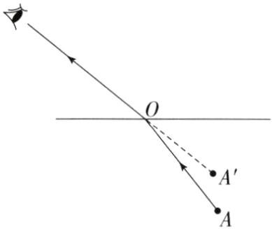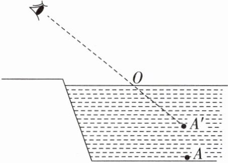 2. 在防溺水教育活动中,老师告诉学生,池塘里水的实际深度比看起来的深度要深,不能贸然下水游泳.如图所示为解释这一现象的情景,其中A为水底的物体,A'是岸边儿童看到的A的像.请你在图中作出过O点的入射光线和折射光线.