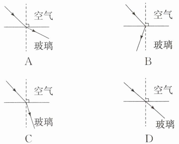 1. 当光从空气斜射进入玻璃中时会发生折射,如图所示,画出的折射光路正确的是(