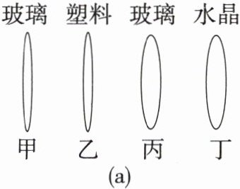 4. 小明在学习了凸透镜后,想探究凸透镜的焦距大小与什么因素有关,于是他让平行光通过如图(a)所示的四个透镜(其中甲、乙和丙、丁是两组形状相同的凸透镜,它们分别用玻璃、塑料和水晶制成).