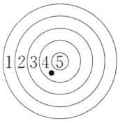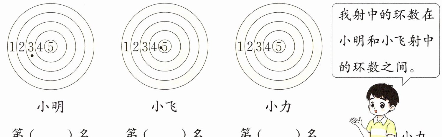 6 先用“·”在靶上标出小力射中的环数,再排名次。