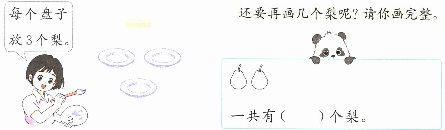(女孩说话:每个盘子放3个梨。旁边有3个盘子图形)