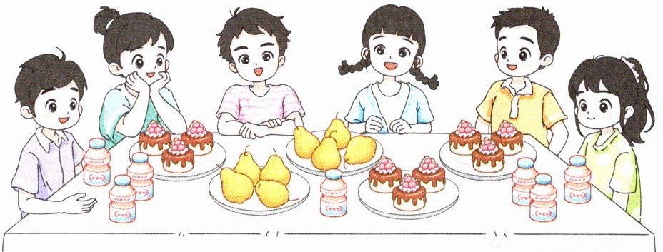 图中有□个小朋友,□个🍐,□块🧁,□瓶🥤。