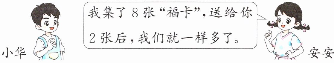 小华:我集了8张“福卡”,送给你2张后,我们就一样多了。