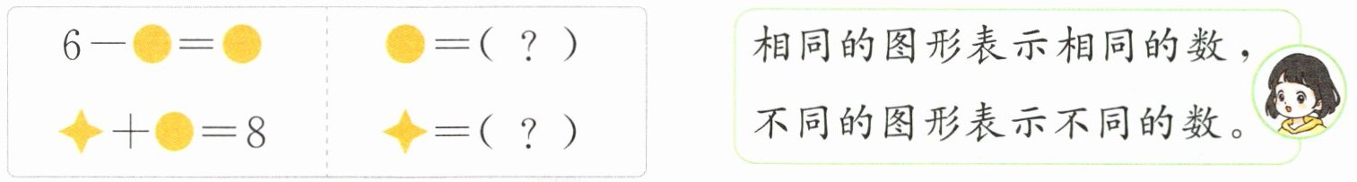 3 3 5 3 3 3 5 3 解析 解决这类问题的关键是找到只含一种图形的算式,先求出这个图形表示的数,再将它代入其他算式,求出其他图形表示的数。第一步 找到只含一种图形的算式,6-●=●。观察算式,6减去●还是●,也就是把6分成同样多的两份,想3+3=6,所以●=3。第二步 将●=3代入◆+●=8,得到◆+3=8,可以求出◆=5。第三步 将求出的结果代入题目进行检验。6-3=3,5+3=8,正确。