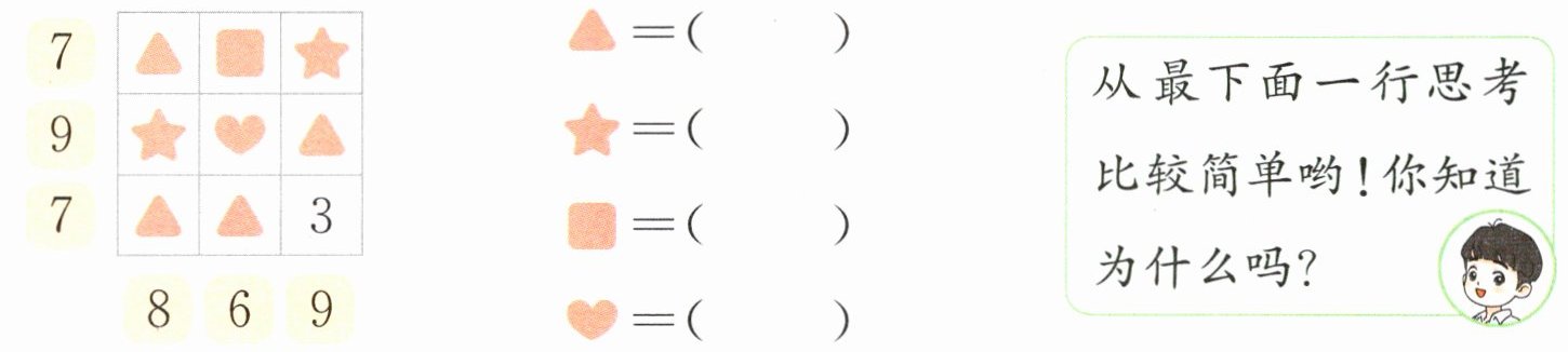 2 4 1 3 解析 第一步 找到只含一种图形的一行,▲+▲+3=7,求出▲=2。第二步 将▲=2代入第一列▲+★+▲=8,得到2+★+2=8,求出★=4。第三步 将▲=2,★=4代入第一行▲+■+★=7,得到2+■+4=7,求出■=1。第四步 将▲=2,★=4代入第二行★+♥+▲=9,得到4+♥+2=9,求出♥=3。第五步 将求出的结果代入题目进行检验即可。