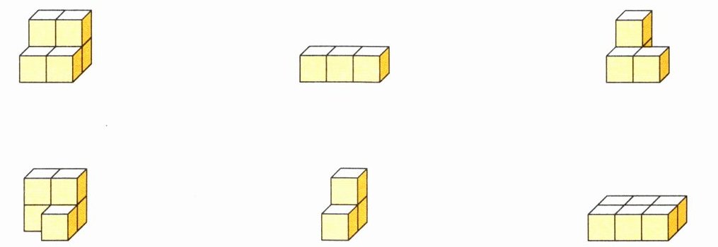 答案:图略(将由4个正方体排成一排的图形与由2行,第一行3个正方体,第二行1个正方体且第二行在第一行中间靠左位置的图形相连;将由2个正方体上下叠放的图形与由2行,第一行3个正方体,第二行1个正方体且第二行在第一行最右边位置的图形相连;将由3个正方体,其中2个正方体上下叠放,另外1个正方体在这2个正方体右边位置的图形与由2行2列的正方体图形相连)