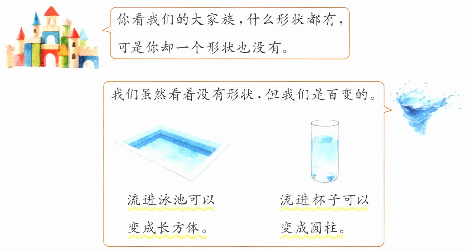 流进泳池可以变成长方体。 流进杯子可以变成圆柱。