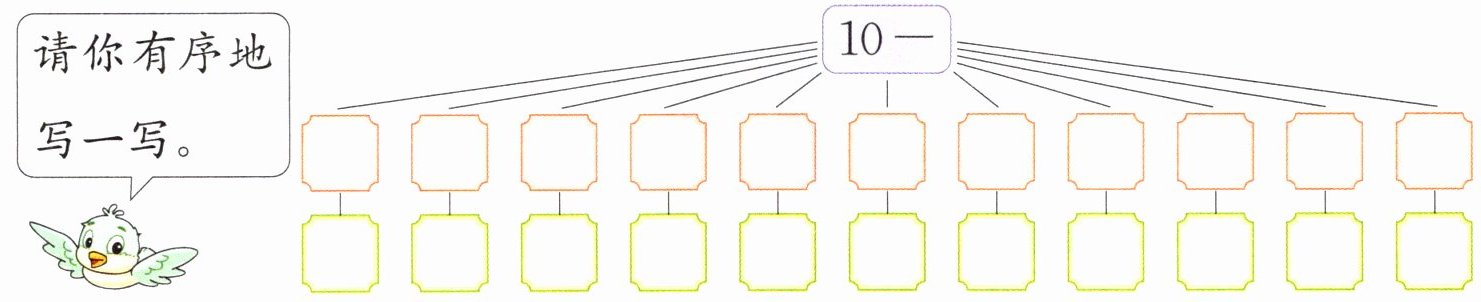示例:0 10 1 9 2 8 3 7 4 6 5 5 6 4 7 3 8 2 9 1 10 0 解析 把算式的减数按从0到10(或从10到0)的顺序写一写,就能保证不重复不遗漏。