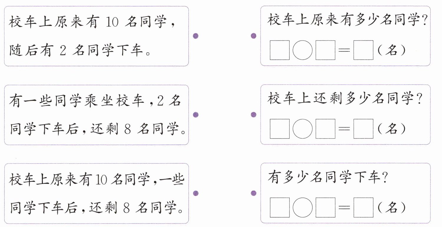 校车上原来有多少名同学? 2+8=10(名) 校车上还剩多少名同学? 10-2=8(名) 有多少名同学下车? 10-8=2(名)