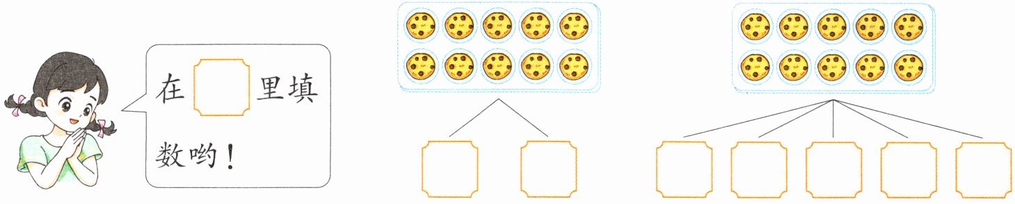 4 把10块饼干分给2人或5人,每人都可以分得同样多。你知道怎样分吗?在下图中填一填。