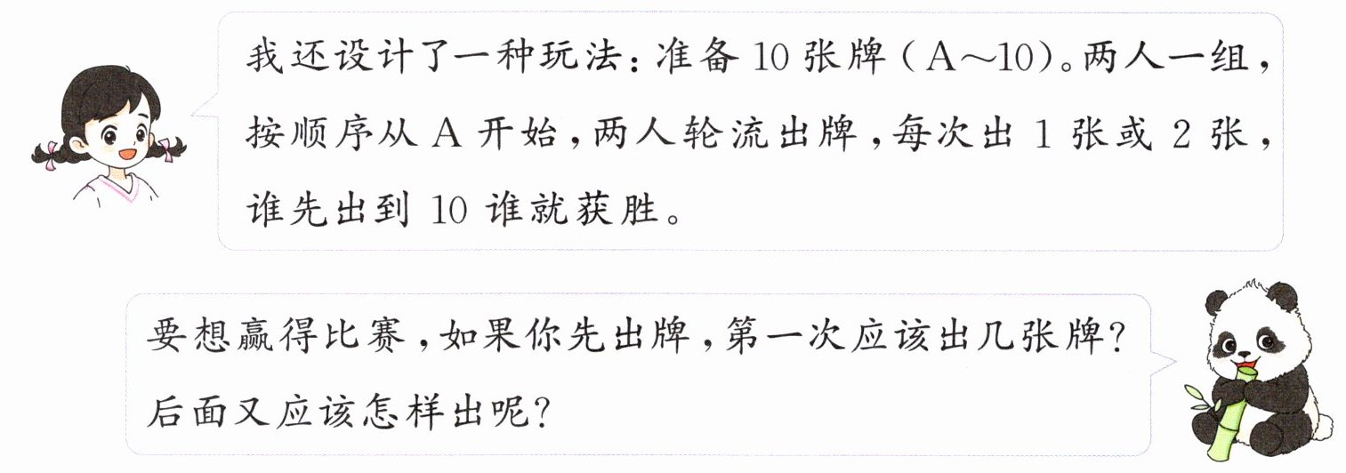 2 我还设计了一种玩法:准备10张牌(A~10)。两人一组,按顺序从A开始,两人轮流出牌,每次出1张或2张,谁先出到10谁就获胜。