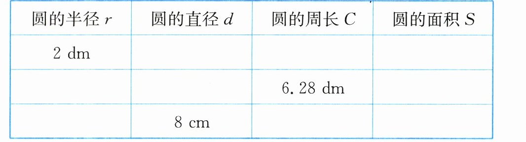 4 dm 12.56 dm 12.56 dm² 1 dm 2 dm 3.14 dm² 4 cm 25.12 cm 50.24 cm²