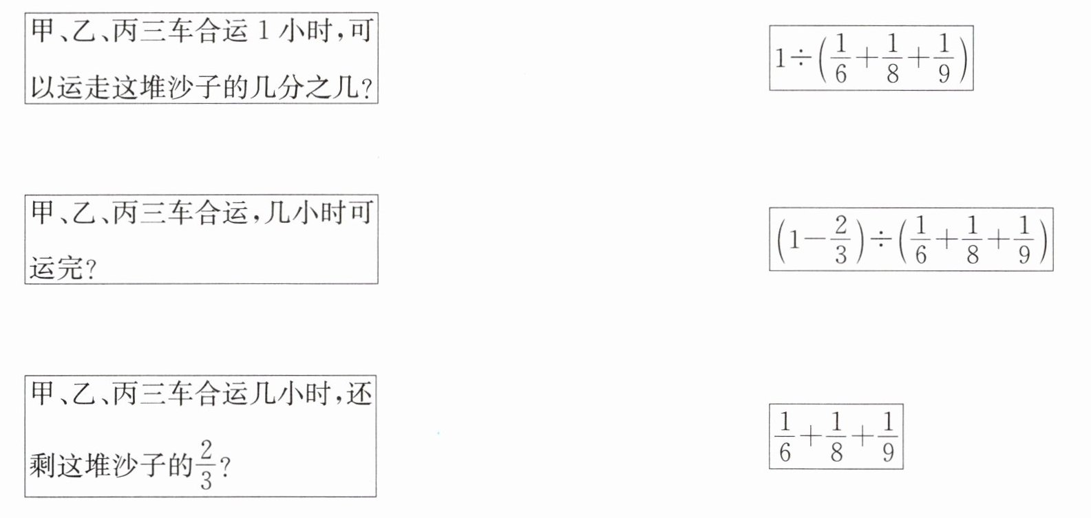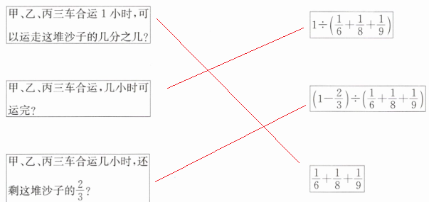 一堆沙子,甲车运完要6小时,乙车运完要8小时,丙车运完要9小时。